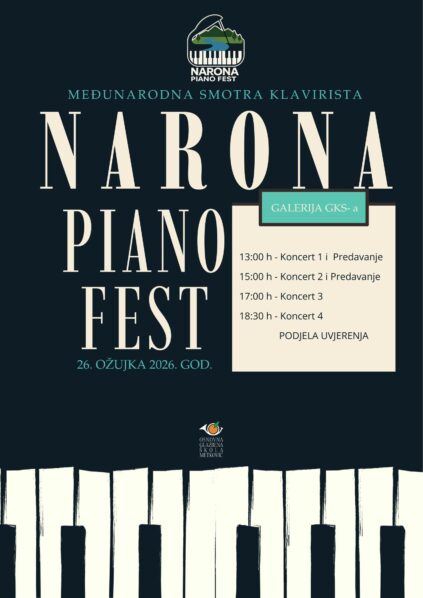 Osnovna glazbena škola Metković s ponosom najavljuje Međunarodnu smotru klavirista Narona Piano Fest, koja će se održati 26. ožujka 2026. godine u Metkoviću.