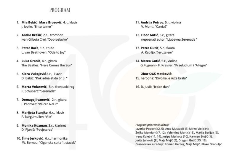 U galeriji GKSa s početkom u 19 sati obilježen je Dan OGŠ Metković, ali i 40 godina formalnog glazbenog obrazovanja. Kao što su to običavali u proteklim godinama, na samom početku, ravnateljica škole profesorica Mihaela Pavlović je podijelila nagrade i priznanja ostavrena u potekloj godini i to učenicima: Domagoju Ivanoviću, Viti Mediću, Anti Žderiću, Anti Kapoviću, Anti Kraljeviću, Sari Bulum, Ivi Kapović, Moniki Kuzman, Mihaelu Jurkoviću i Matei Gutić, zatim učiteljima: Željki Mandariću, Roku Dropuljiću, Mariji Berljak, Valentini Martić, Erni Čizmić Rebić i Ireni Kaleb te korepetitorima: Romeu Hercegu i Maji Majić. Posebnu novčanu nagradu na prijedlog ravnateljice škole dobila je učiteljica violine Irena Kaleb čija je učenica ove godine osvojila 1. mjesto u 3. kategoriji na Međunarodnom natjecanju Mladi virtuoz 2025. u Zagrebu i Nagradu za najbolju izvedbu zadane skladbe.