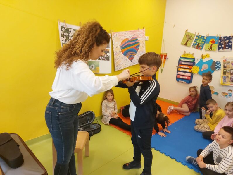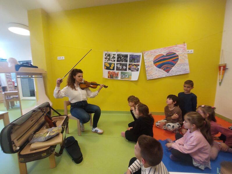 U našem Srednjišnjem vrtiću – Vedri dana grupe predškolaca posjetila je profesoica violine Irena Kaleb. Prezentirala je svoj instrument i boju zvuka violine. Vrtićani su s radošću upoznali čitavu obitelj violine. Upijali su graciozne pokrete gudala i anđeoski zvuk violine. Violinom je profesorica ispričala djeci bajku satkanu od zvukova iz prirode i glasanja raznih životinja. Zajedno su za kraj ovog posjeta svirali Mozartovu skladbu Blistaj, blistaj!