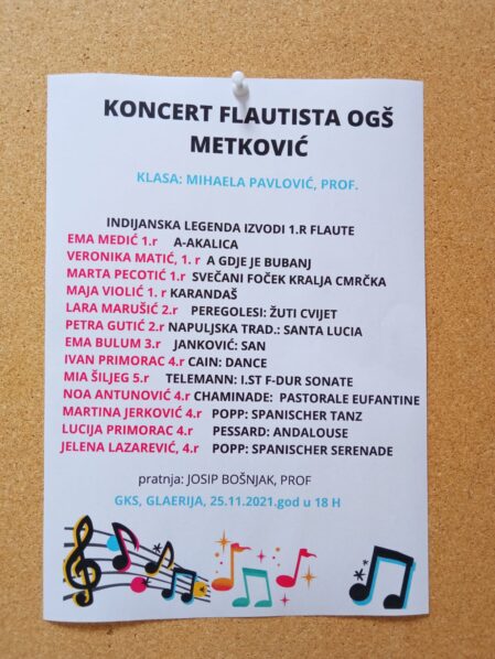 25.11.2021.god s početkom u 18 h,u galeriji GKS Metković, održan je Koncert flautista OGŠ Metković. Prvi je to nastup prvašima ali i nekim drugašima obrzirom na sve šta se događalo vezano za epidemiju korona virusa. Učenici i rodtelji su pokazali oduševljene što smo ponovo u GKSu i što ponovo uživo slušaju naše točke. Koncert su otvorili prvaši-flautisti sa Legendom o zmijama, gdje su pokazali što su sve savladali na prvim satima flaute.