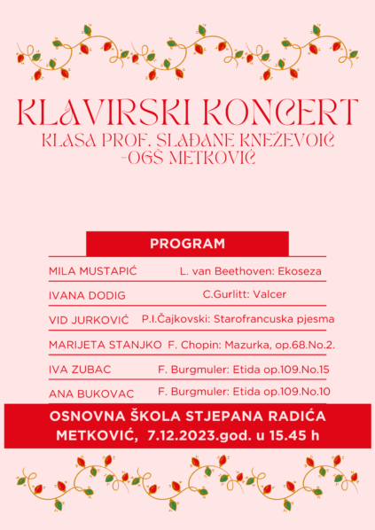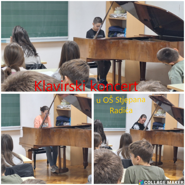 Profesorica Slađana Knežević upriličila je konecert klavirsta za učenike OŠ Stjepana Radića Metković. Na koncertu su nastupili učenici njezine klase, a predstavili su klavir kao glazbeni instrument i pripremljene kompozicije učenicima navedene općeobrazovne ustanove. Koncert je Božićni poklon učenika prof. Slađane svojim vršnjacima, a održan je 7.12. 2023.god s početkom u 15.45. h, u prostorijama Osnovne škole Stjepana Radića, Metković.