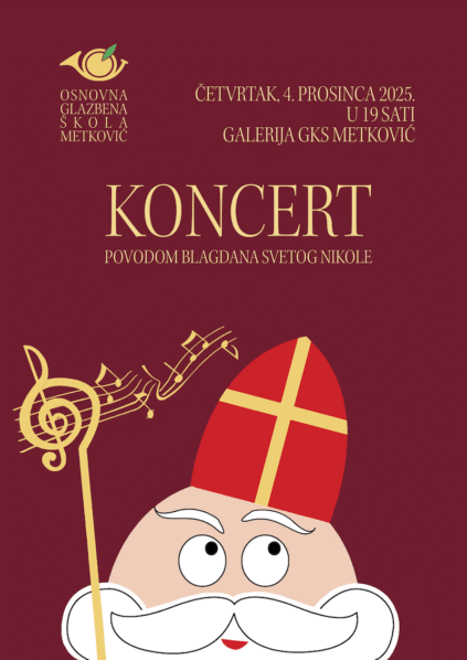 Osnovna glazbena škola Metković s radošću najavljuje tradicionalni koncert povodom blagdana sv. Nikole, koji će se održati u četvrtak, 4. prosinca 2025. godine u dvorani Gradskog kulturnog središta Metković, s početkom u 19 sati.
