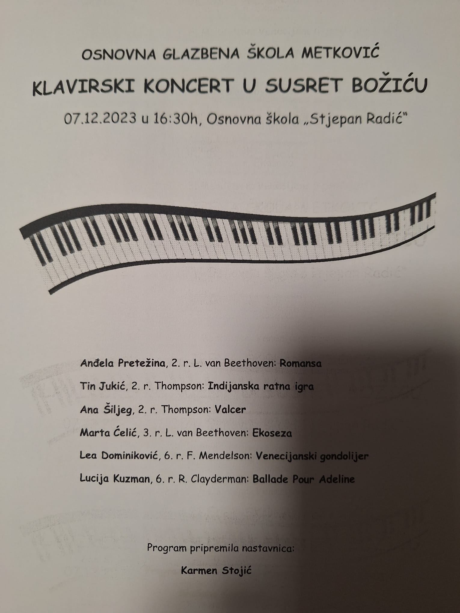 Učenici profesorice Karmen Stojić nastupili su 7.12. 2023. u 16.30h u Osnovnoj školi Stjepana Radića, Metković. Uvježbani repertoar prezentirali su svojim kolegama-vršnjacima. pod nazivom “U susret Božiću” Koncert je organizirala i upriličila prof. Stojić , a dočekala ju je nastavnica glazbene kulture Anita Cuca Bebić sa svojim učenicima.