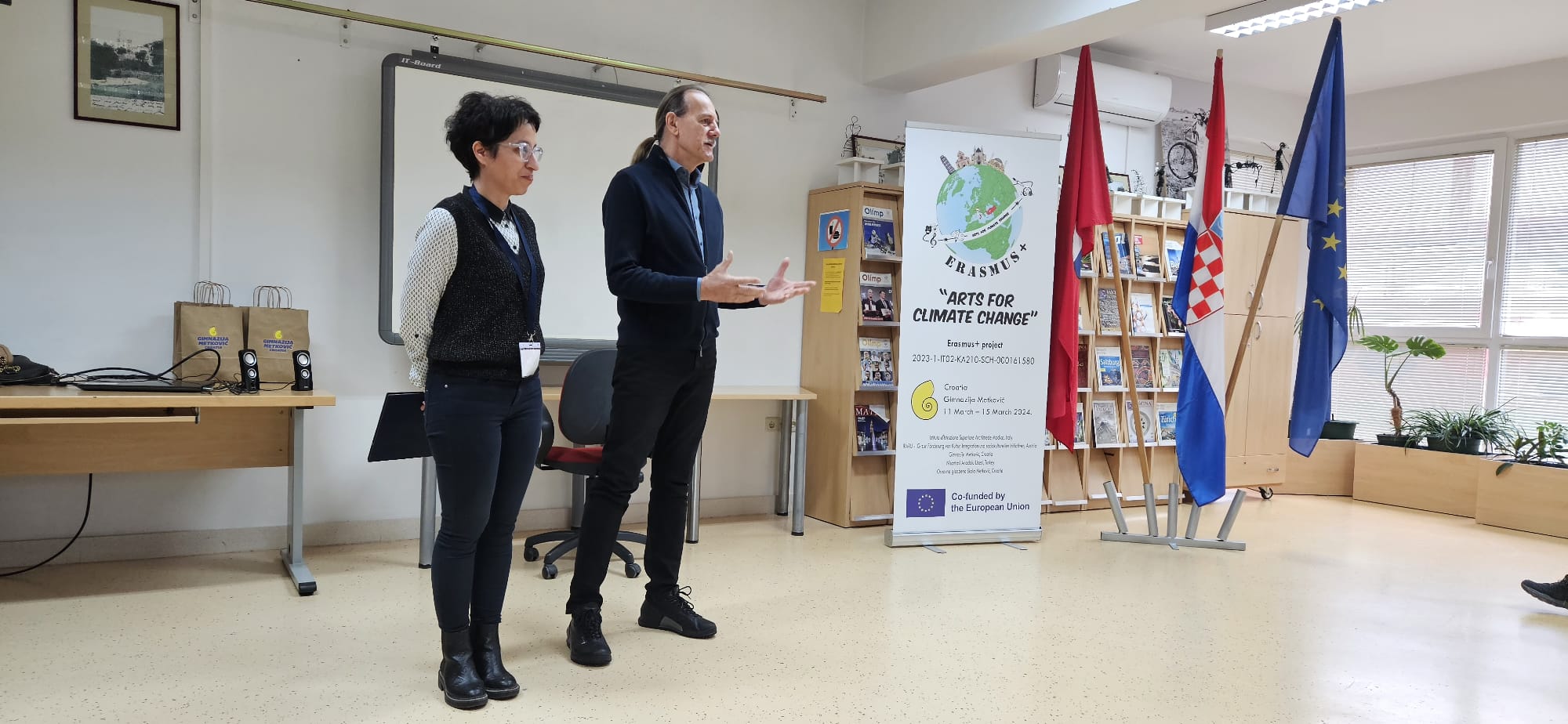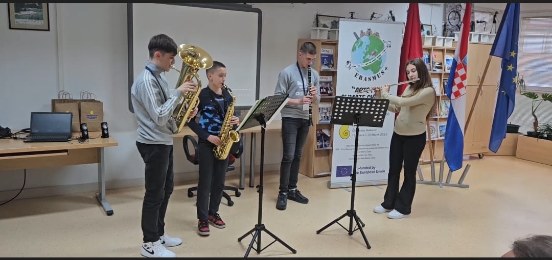 U sklopu Erasmus+ projekta “Arts for climate change”, prošli tjedan OGŠ Metković je bila uz Gimnaziju Metković sudomaćin gostima iz Turske, Italije i Austrije. Na svečanom otvorenju mobilnosti u Gimnaziji Metković , gostima se obratio i naš ravnatelj, gosp. Zvonko Knežević te svima zaželio uspješan rad i dobar porovod u našem malom gradu. Tema ove mobilnosti pod nazivom “Arts in classroom” uključivala je arhitekturu za koju je bila zadužena Gimnazija i glazbu čije radionice organizirala naša škola, odnosno koordinatorica projekta u našoj školi, profesorica Mihaela Pavlović. Glazbene aktivnosti uključile su tako obilazak Vjetroorgulja u Rogotinu, oblilazak glazbene škole i gradskog orkestra, izradu eko-instrumenata od recikliranih materijala, izlaganje prezentacija primjera kako se sve glazbom može utjecati na klimatske promjene te snimanje glazbene improvizacije “Stop the climate change” izvedene isključivo instrumentima napravljenim tijekom naše radionice.